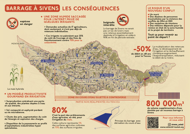 Notre action vise actuellement à obtenir la réhabilitation de la zone humide (comme l’exige le droit), l’évolution agro-écologique de toutes les fermes du bassin du Tescou comme alternative à tout nouveau projet de barrage sur la zone humide du Testet et l’amnistie de toutes les condamnations d’opposants ayant légitimement lutté contre ce projet illégal.