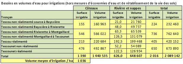 Ainsi sur la partie non réalimentée du Tescou entre Tescounet et Bayssière les volumes nécessaires à mobiliser se répartissent comme suit en valeurs arrondies :