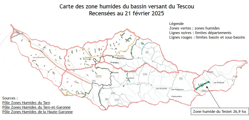 Sur les 138 zones humides recensées sur le bassin du Tescou, d’une surface moyenne de 1 ha, la zone humide du Testet est, de loin, la plus importante avec ses 26,9 ha.