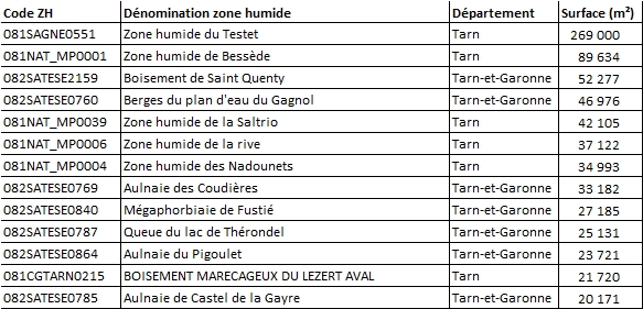 Liste des plus importantes zones humides du bassin versant du Tescou