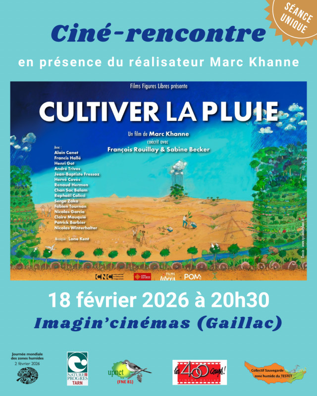 Dans le cadre des journées mondiales des zones humides 2026, les associations les 400 coups, Nature & Progrès Tarn, L'Union de Protection de la Nature et de l'Environnement du Tarn (UPNET-FNE81) et le collectif Testet coorganisent une ciné-rencontre le mercredi 18 février 2026 à Imagin'cinémas de Gaillac.