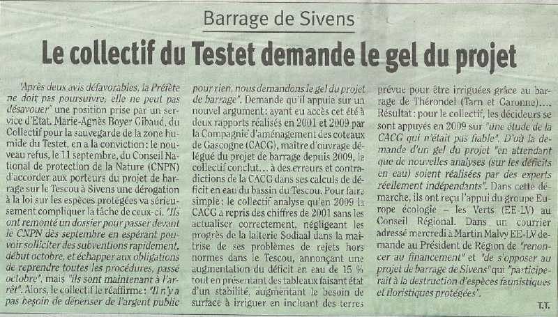 L'article du Tarn Libre du 20/09/13 (en dessous de l'interview de Thierry Carcenac qui parle du barrage et de nous aussi... télécharger le PDF de la page)
