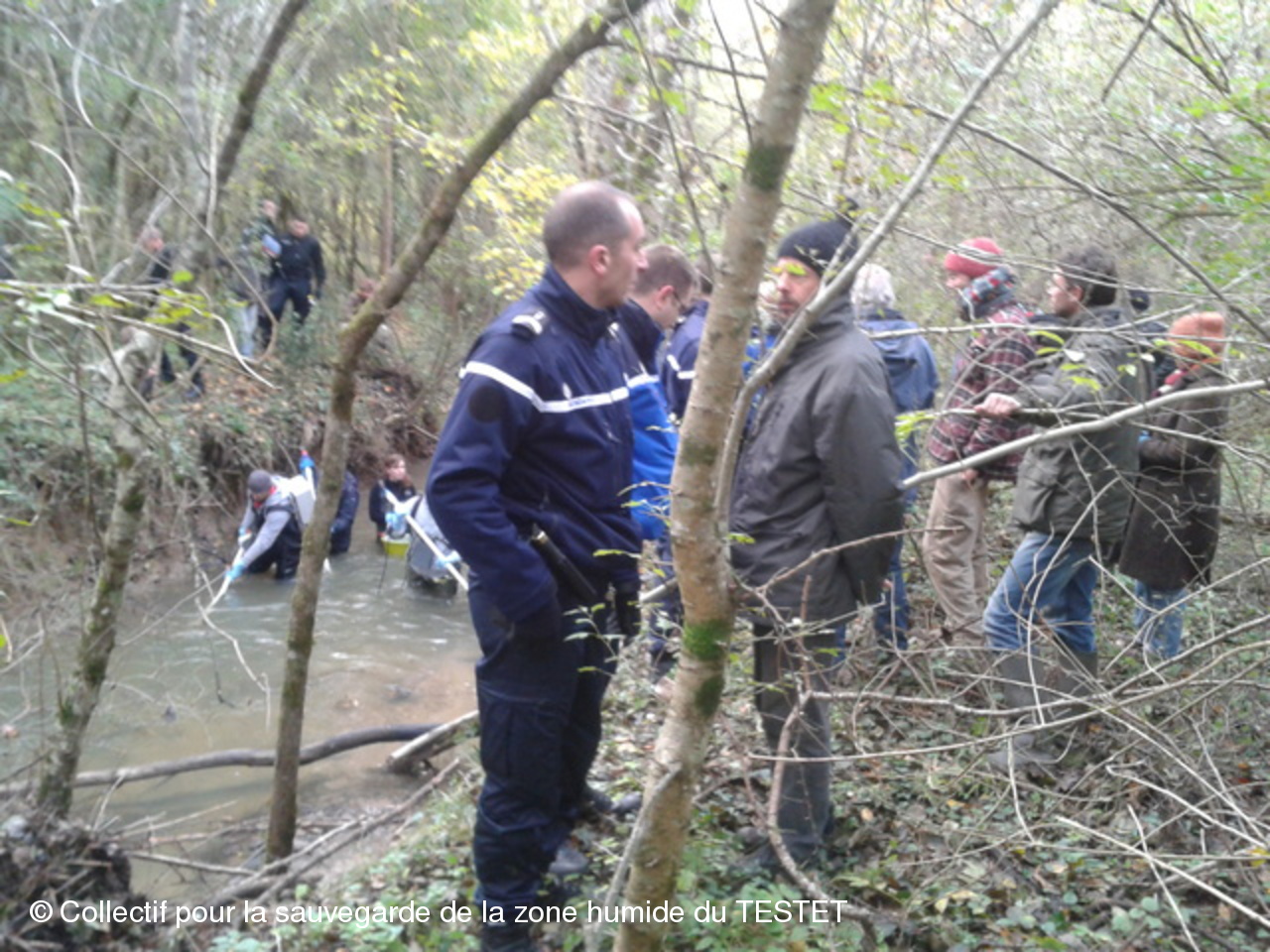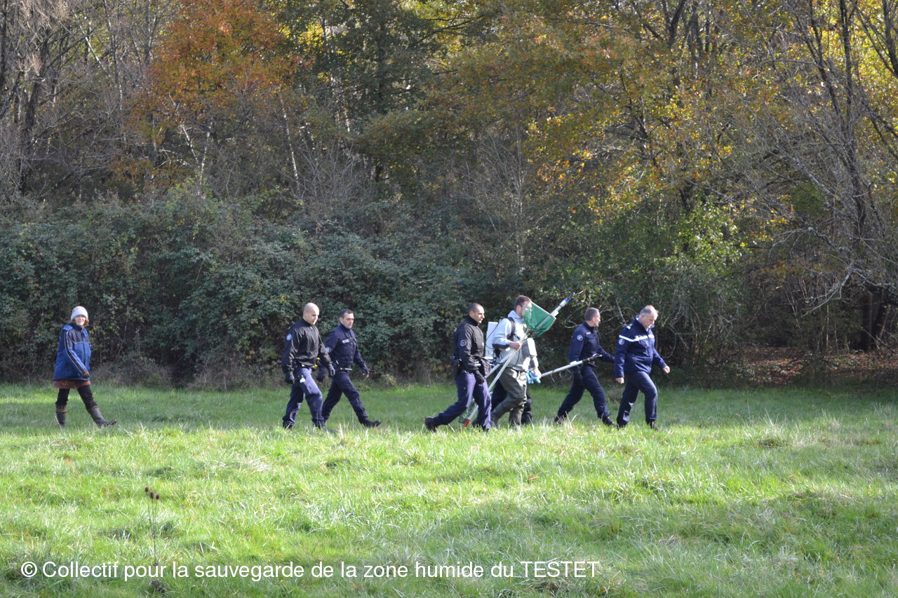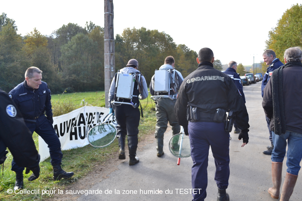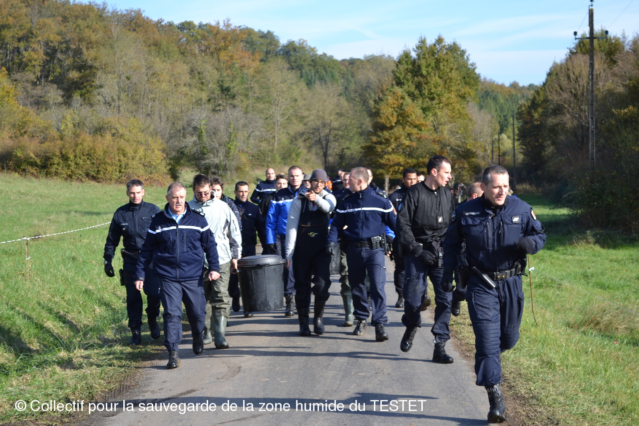 Un peu avant 12h, les naturalistes et leur essaim de gendarmes ont ramené leurs prises à leur voiture. Encadrés par plusieurs voitures de gendarmerie, les naturalistes sont allés relâcher les poissons capturés en amont du site du chantier.