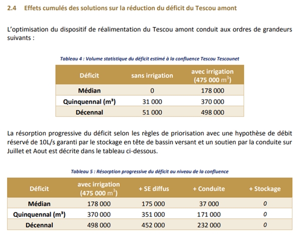 A ce jour le « SCHEMA D’ORGANISATION DE LA MOBILISATION ET DE LA GESTION DE LA RESSOURCE POTENTIELLE EN EAU DANS LA VALLEE DU TESCOU » publié sur le site de l’Agence de l’Eau Adour-Garonne (lien ici) identifie page 23 les solutions pour résorber le déficit pour assurer 40l/s au confluent du Tescounet et 475.000 m3 pour les prélèvements agricoles projetés (voir bas de la page 12 et haut de la page 13).